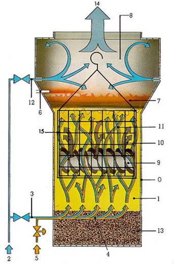 14. These inert dust particles are seperated from the flue gases by de-dusting through a cyclone battery or ceramic filter. The particles fall into the collector reservoir under the cyclone or ceramic filter and can easily be removed.