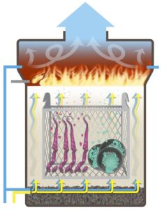 The next cycle can begin immediately by immersing another basket in the fluidized bed with the hoisting system.